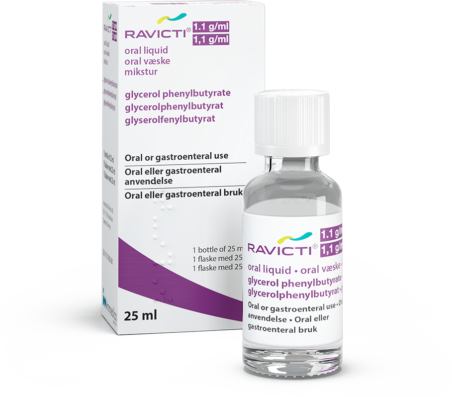 A RAVICTI® (glicerin-fenilbutirát) az UCD-k minden korosztály számára alkalmazható egyik kezelési módszere. A gyógyszer célja, hogy csökkentse a vérben lévő ammónia mennyiségét, hogy ezáltal mérsékelje a neurológiai következményeket.1 A RAVICTI egy belsőleges folyadék, vagyis szájon át kell szedni.